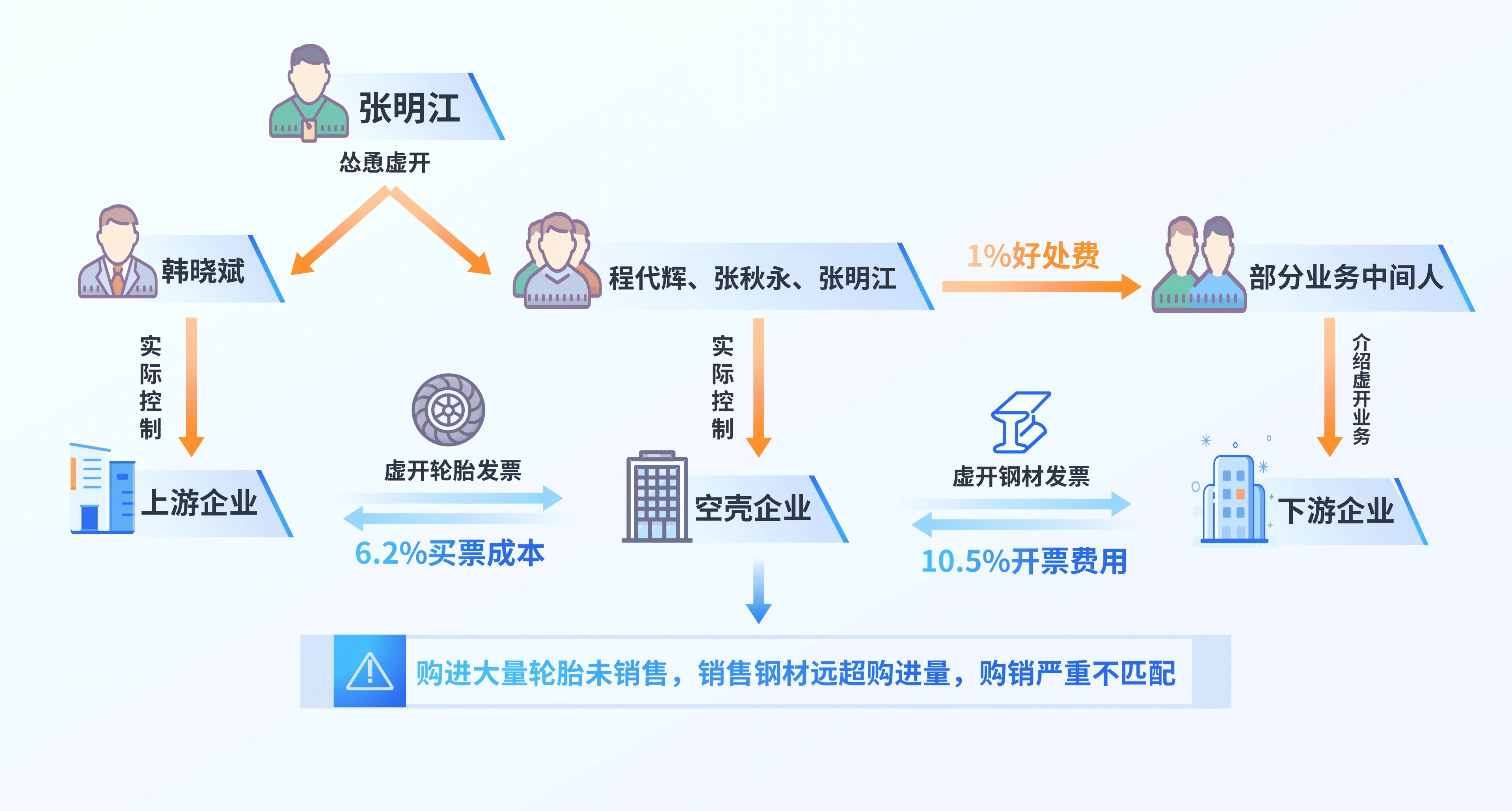 近期,三明市税务部门联合公安机关依法查处涉税中介张明江筹划参与团伙虚开增值税专用发票案件。经查,张明江借经营涉税专业服务便利,获取其被代理企业发票盈缺信息,涉及虚开增值税专用发票775份,价税合计7396.03万元。税务部门依据《中华人民共和国发票管理办法》规定,对张明江为他人开具、让他人为自己开具的增值税专用发票定性虚开;依据涉税专业服务管理相关规定,对其采取列为涉税服务失信主体等措施。2025年3月,张明江及其他5名团伙成员因犯虚开增值税专用发票罪分别被判处拘役或有期徒刑,刑期三个月至三年十个月不等,并处罚金合计73.5万元,没收违法所得224.62万元。 疑点重重:购销不匹配、账实不相符、任职交叉重合…… 前期,三明市税务局第三稽查局通过税收大数据分析,发现福建省和顺祥经贸有限责任公司(以下简称“和顺祥公司”)从上游企业购入了3万余套轮胎和1000多吨钢材,但却向下游企业销售5000吨钢材,购销严重不匹配。 一个主营钢材的企业,购进大量“轮胎”未销售、销售“钢材”又远超购进量,是否是变换货物品名开具发票?据此,三明市税务部门依法对这家钢材企业进行立案检查。 检查人员实地检查,发现该企业注册地址无人办公,也没有仓储场所,那购进的3万余套轮胎去哪了呢? 为进一步查明真相,检查人员深入分析该企业主要成员、上下游企业信息等,发现公司财务负责人张明江同时代理着100多家企业的财税业务,包括和顺祥公司及其上游5家企业在内的多家企业,且这些企业存在重合交叉任职、注册地址一致、成立时间相近等情况。 异常的购销、消失的库存、重合的人员……面对诸多疑点,税务部门决定同时对上游5家企业进行立案检查。 精准锁定:数据相互印证揭开隐蔽犯罪手法 立案后,检查人员依法对张明江办公场所进行了突击检查,取得张明江电脑内电子数据,发现名为“应收应付”“利润测算”等电子表格,里面大量记载了和顺祥等6家企业开票方名称、开票金额、开票费用、买票成本、利润等信息。经与这些公司的经营业务比对,发现所谓的“利润”实为开票费用扣除开票成本,与正常公司的利润获取方式不同,涉嫌对外虚开发票牟利。 检查人员进一步分析了涉案企业的发票流、资金流和外调取证资料,发现发票流向和资金流向等均与上述取得的电子数据一一印证,且资金流呈现出以下特点:所有交易都由下游发起打款,涉案企业收到款项后,转入上游对公账户,基本在当天内层层转账,闪进闪出,扣除固定比例的开票费用,最终流向下游指定的个人账户中,形成资金流闭环。 经研判发现涉案企业分布在省内外多地,企业多、金额大,稽查部门将该团伙疑点线索依法移送公安机关,开展联合办案。综合资金流、发票流以及后续更多可靠证据,两部门联合展开收网行动。检查人员在现场查封了大量物证,包括该团伙控制的多家公司的营业执照、印章、账簿、电子设备等,成功抓捕张明江、程代辉、张秋永、韩晓斌等5名涉案嫌疑人,1名涉案嫌疑人主动投案自首。 在大量证据面前,张明江不得不承认,在其担任多家企业财务负责人期间,他了解到企业存在大量无需开票订单所产生的“富余票”有利可图,于是伙同程代辉、张秋永、韩晓斌等人虚构经营业务,帮助程代辉、张秋永从韩晓斌手中以6.2%的手续费购进发票,并以10.5%的手续费卖出发票,从中赚取差价。 至此,这起由涉税专业服务人员筹划、参与的团伙虚开增值税发票的违法事实已清楚。